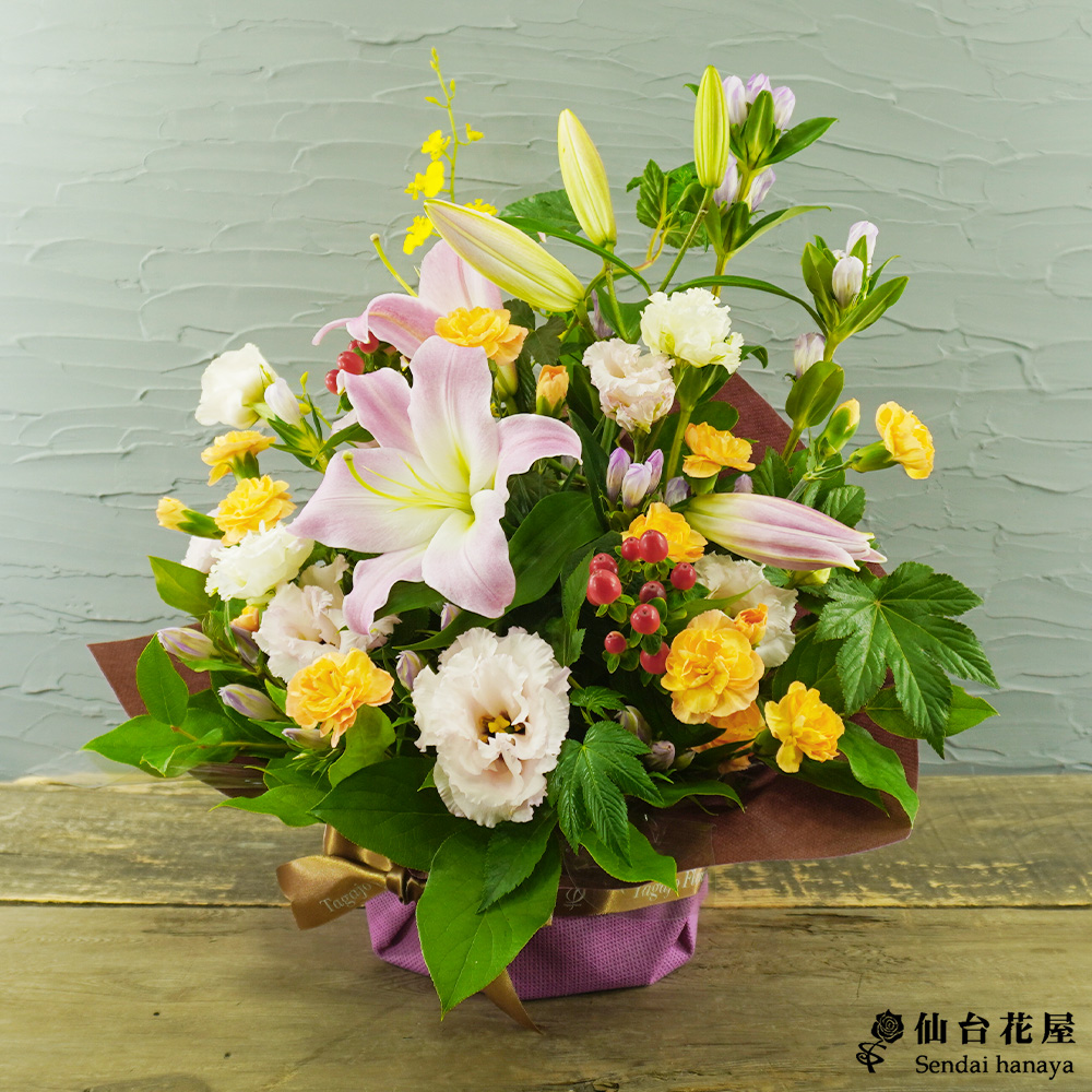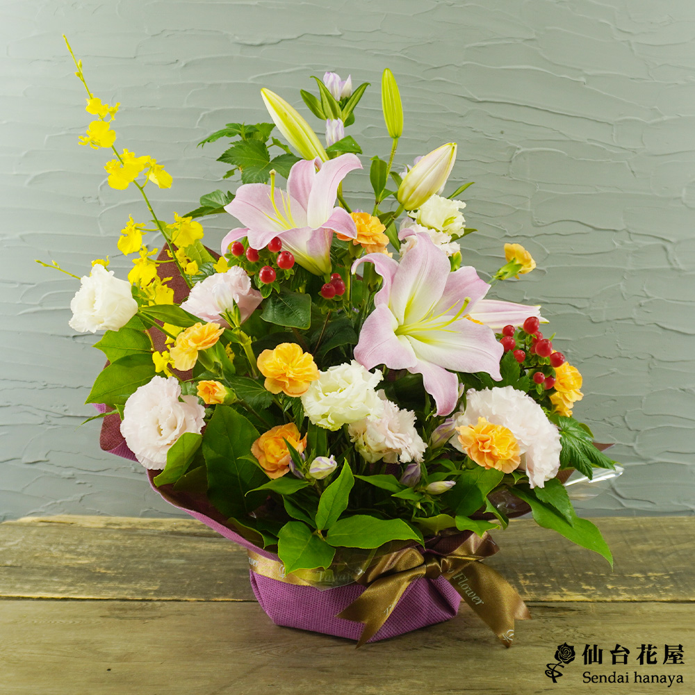 - ユリ、オンシジューム、ヒペリカム、トルコキキョウ、スプレーカーネーション、リンドウ、葉
