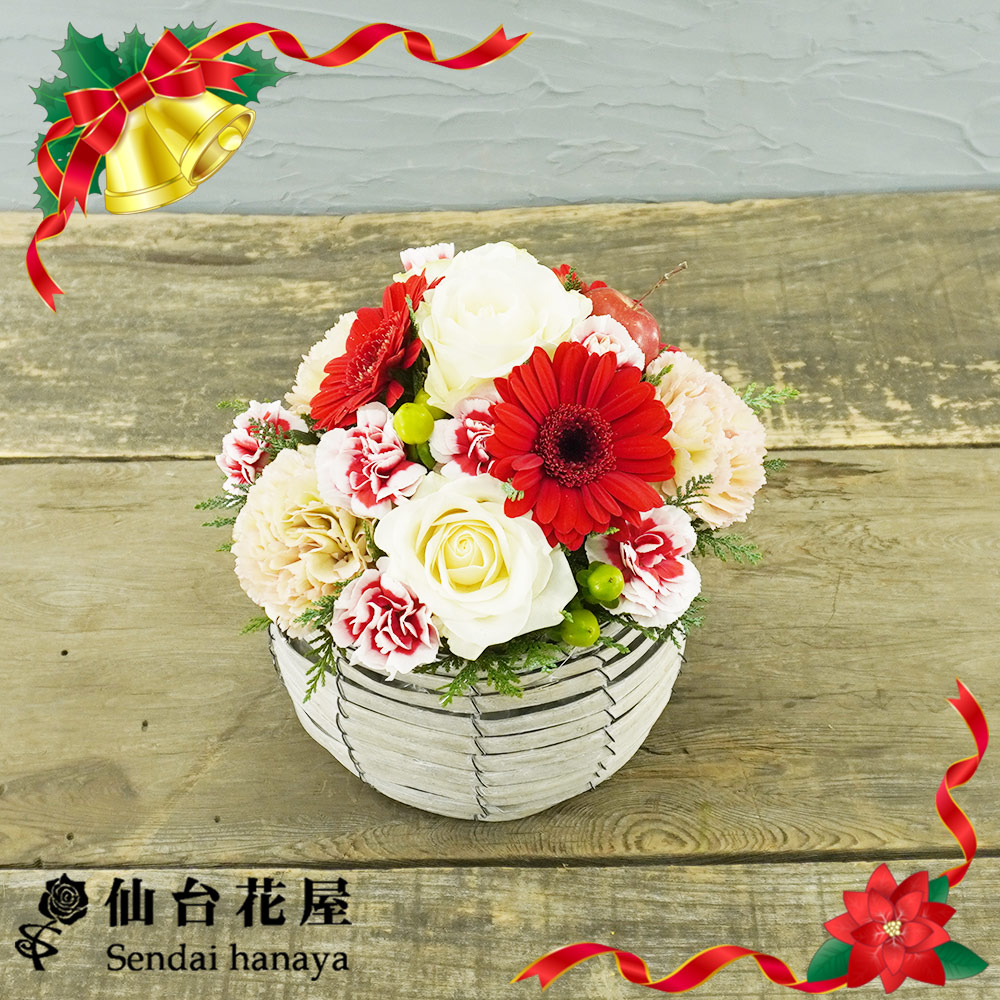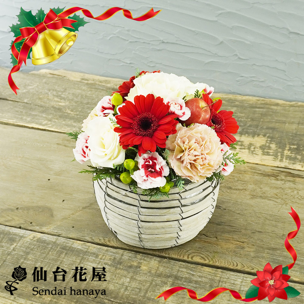 - 真っ白なバラと真っ赤なガーベラのコントラストが美しい、クリスマスを連想させるアレンジメントです!今人気のダスティカラー(くすんだ色)のカーネションも入っていて、より大人な雰囲気のアレンジメントとなっています。他にも小さいグリーンの実のピペリカムや、よく見ると小さいりんごの可愛らしいオーナメントが入っていますよ♪