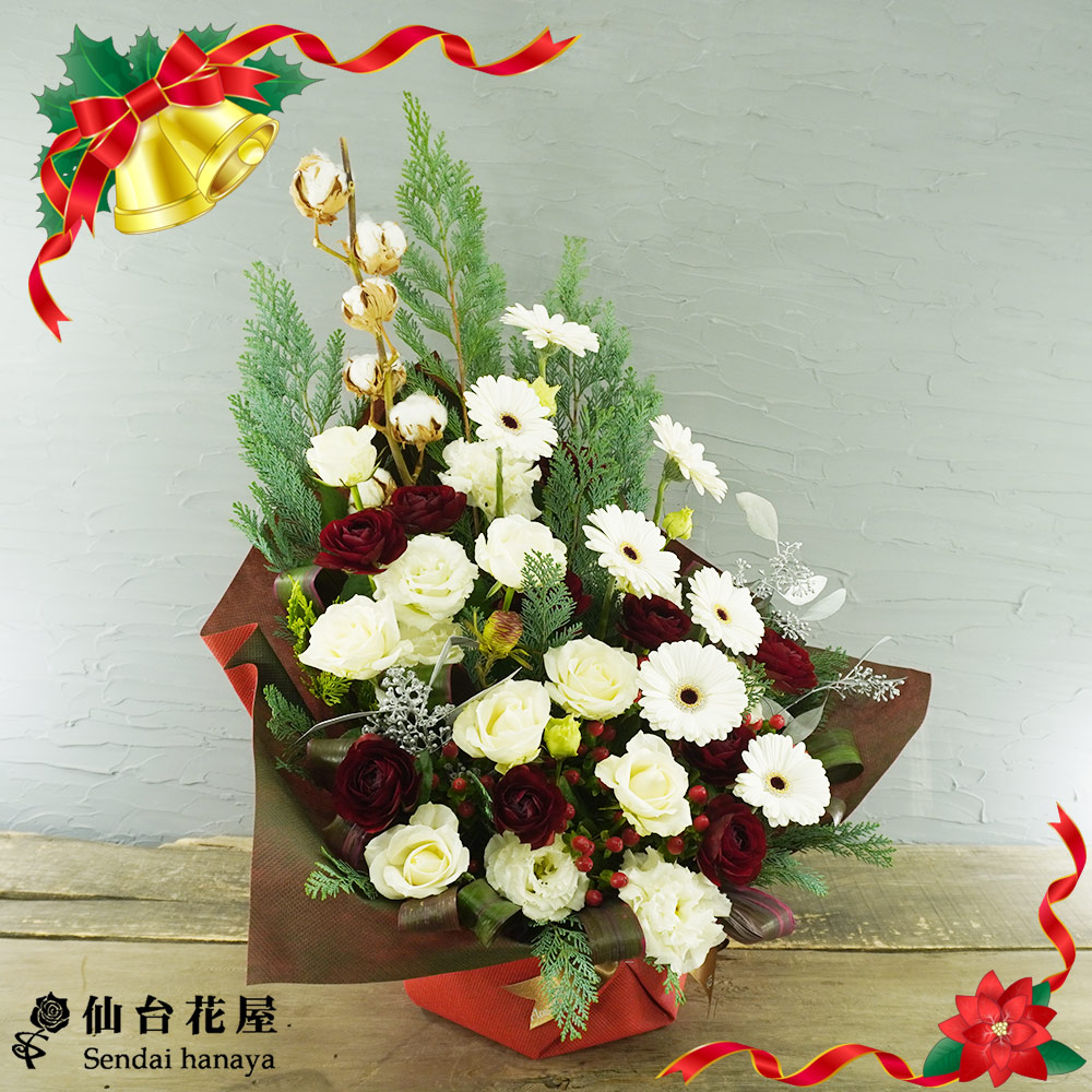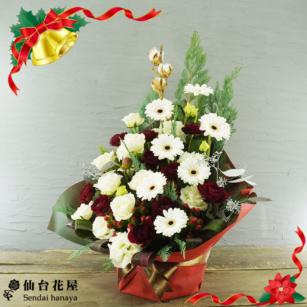 - 真っ白なガーベラ、トルコキキョウ、バラなどをメインに、ホワイト系に統一したアレンジメントです。ちらりと見える小さな実のピペリカムのレッドと、ラッピングのシックなレッドが、クリスマスが来る!とわくわくさせてくれます♪そして、バックに入っているグリーンが、まるでクリスマスツリーを表しているようです!ふわふわとしていて、素朴で温かみのある見た目のコットンフラワーが、ナチュラルな雰囲気も演出してくれています!