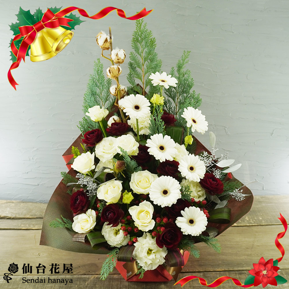 - 雪のように白いお花がたっぷりと使用されている、冬のクリスマスアレンジメントです。フラワーギフトとして人気の高い、ガーベラ、バラ、トルコキキョウなどがふんだんに使われいて、クリスマスプレゼントにもフォーマルなシーンでも活躍することができます!同じ白色でも花言葉はそれぞれ違い、白いバラの花言葉は、「清純」、「純潔」、白いガーベラは「希望」、「律儀」、白いトルコキキョウは「永遠の愛」です。ラッピングの赤、そしてグリーンがお花の純白さを際立ててくれていて、とっても美しいです♪